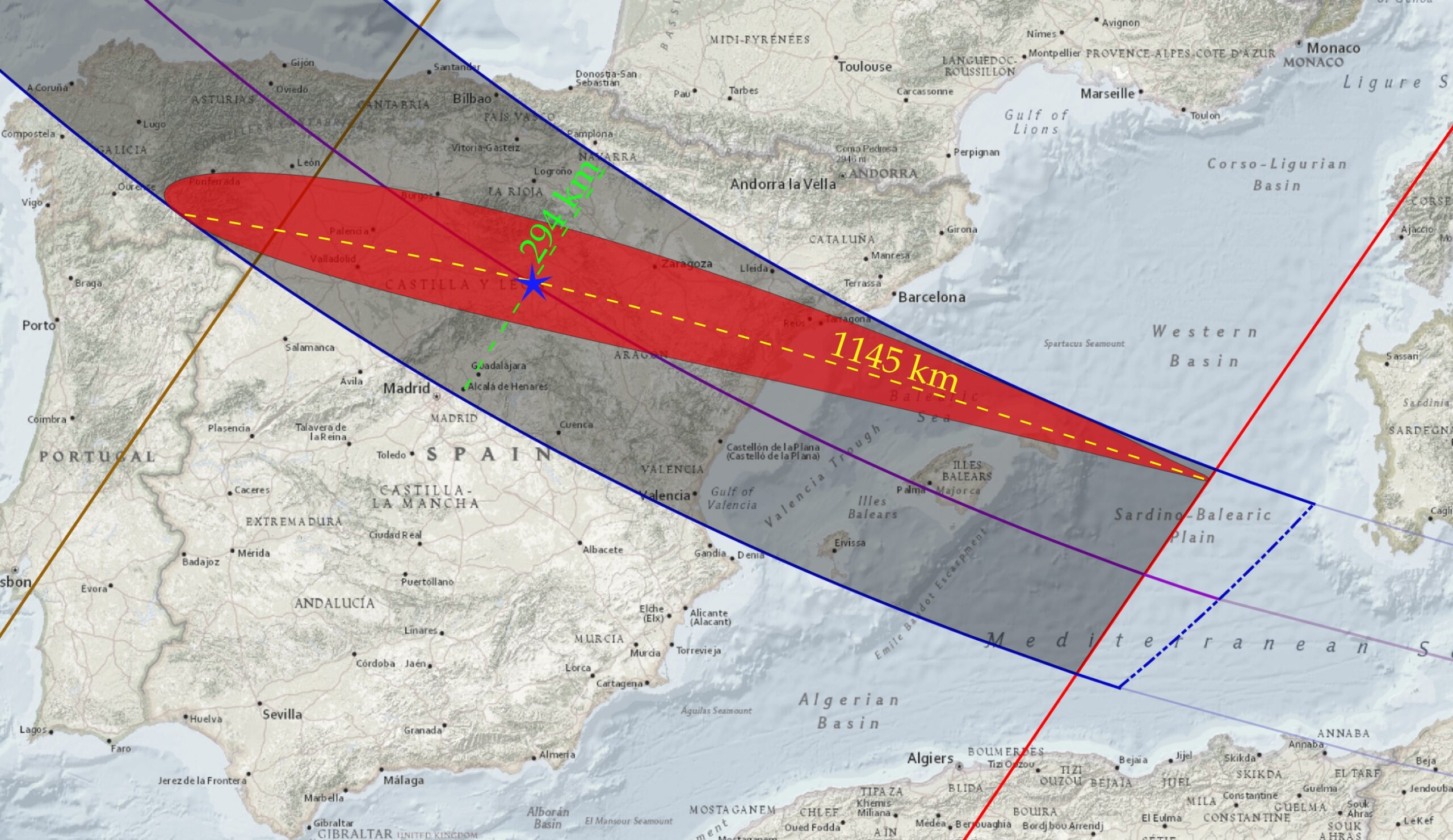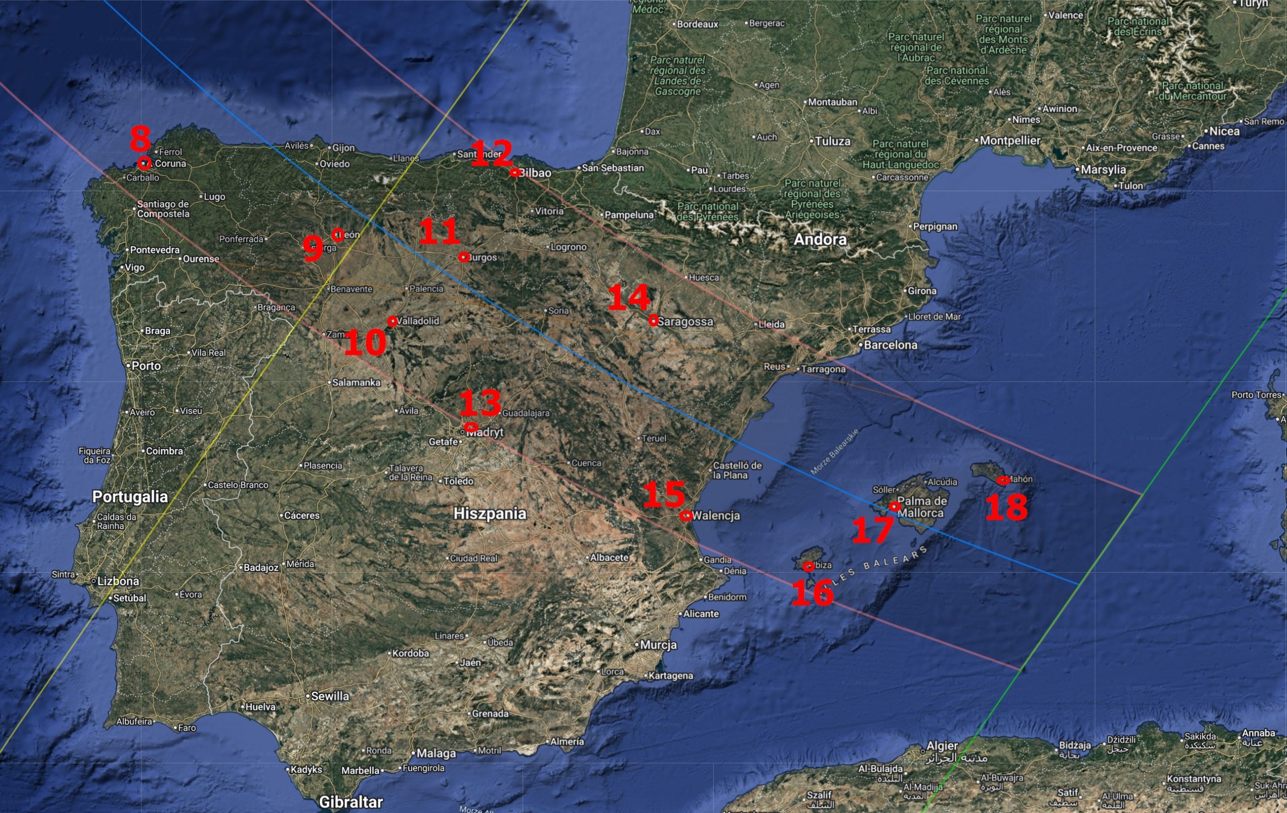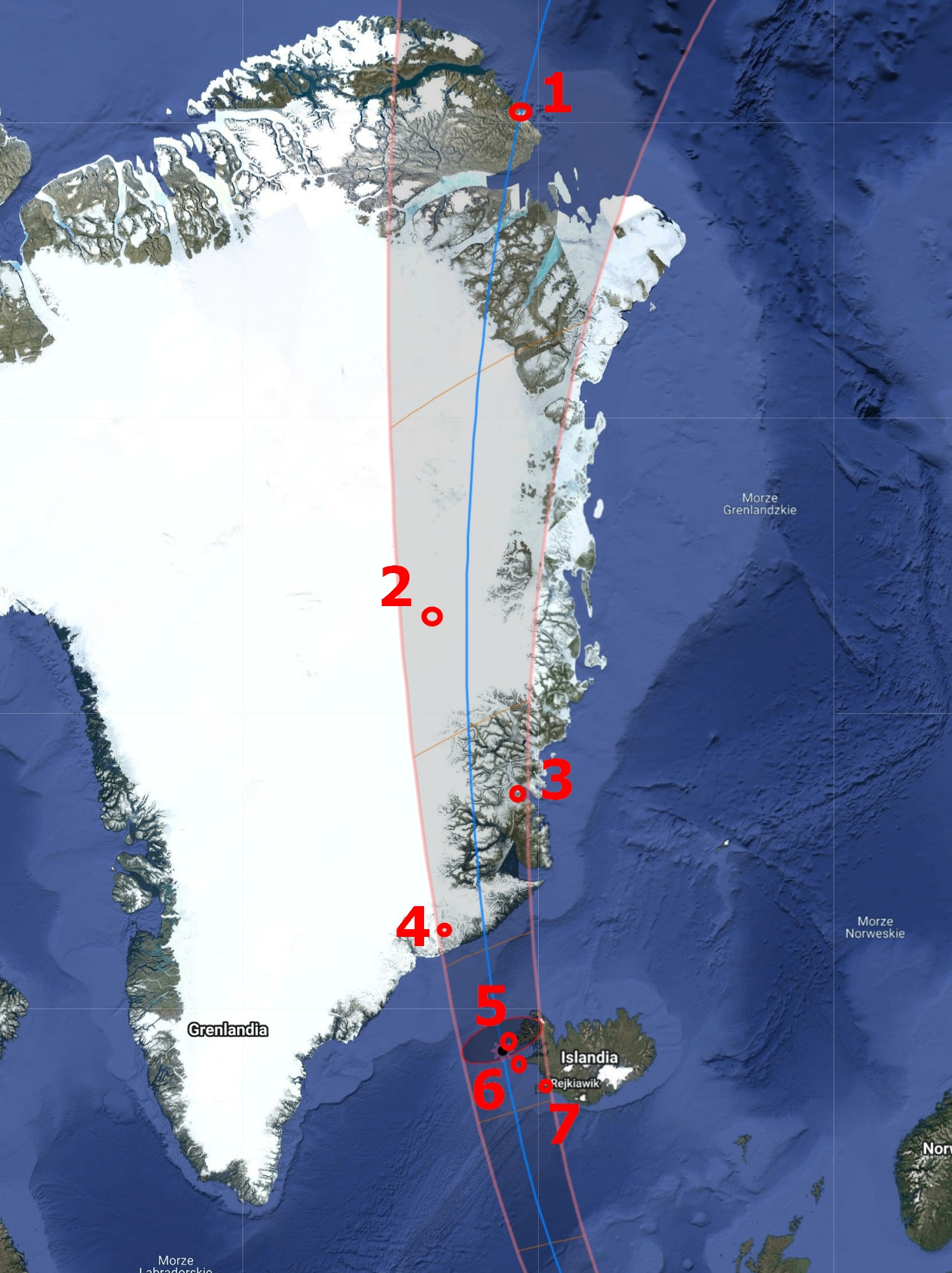 The eclipse path begins at the eastern part of the Taymyr Peninsula in Russia. It proceeds over the Arctic Ocean, where it just misses the North Pole, and continues to Greenland, the World’s largest island. Then, the path continues over western Iceland and the North Atlantic towards the Bay of Biscay and the westernmost part of the Cantabrian Sea, where it enters the Iberian Peninsula. After that, the path proceeds across Spain and grazes the Portuguese border. On its further way, it encounters the Balearic Sea and the Balearic Islands. Finally, it finishes at the Mediterranean, west of the island of Sardinia and north of the Algerian Atlas Mountains.
