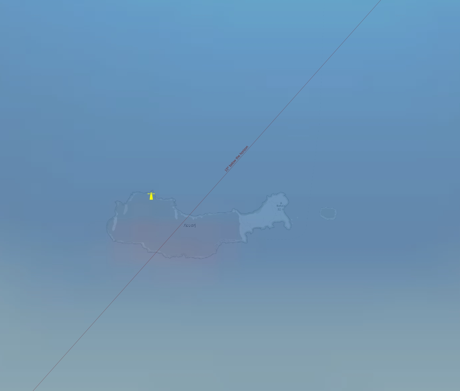 16. Gavdos – the island known as the southernmost point of Europe, lies closest to the projected extension of the umbra and offers one of the clearest skies at once. The Bortle 1 sky is one of the clearest in Europe, but the historic lighthouse being in operation disrupts it. The greatest eclipse will occur 13,5° below the horizon. See the street view example here.