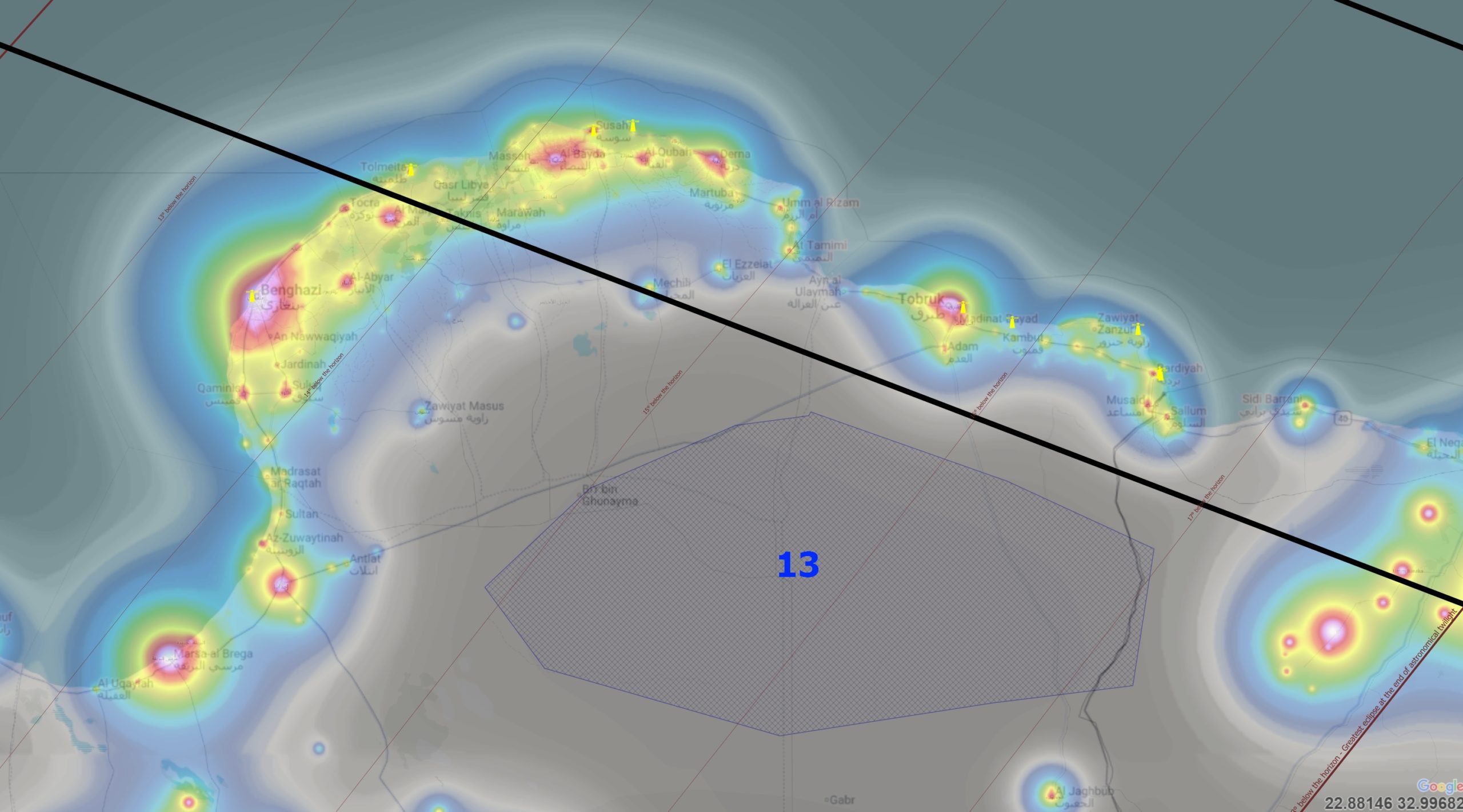 13. North Libya – the best place for watching the 2026 solar eclipse below the horizon event, as the area of Bortle 1 sky is so large, covering a distance of about 400km! Despite the deep position of the Sun, as the event happens at early astronomical twilight, it should be noticeable. The best is to set yourself in the middle of the route between Tobruk and Ajdabiya. At solar direction, some faint glow from Benghazi can be detected at a distance of 225km.