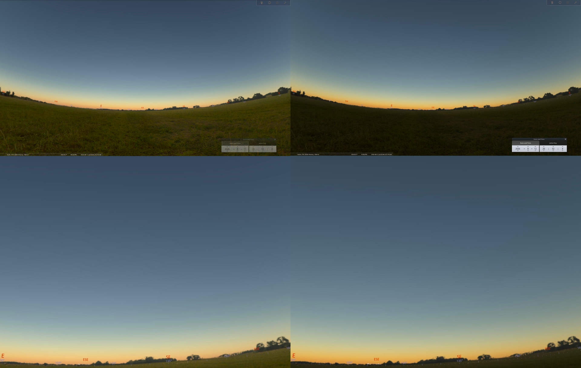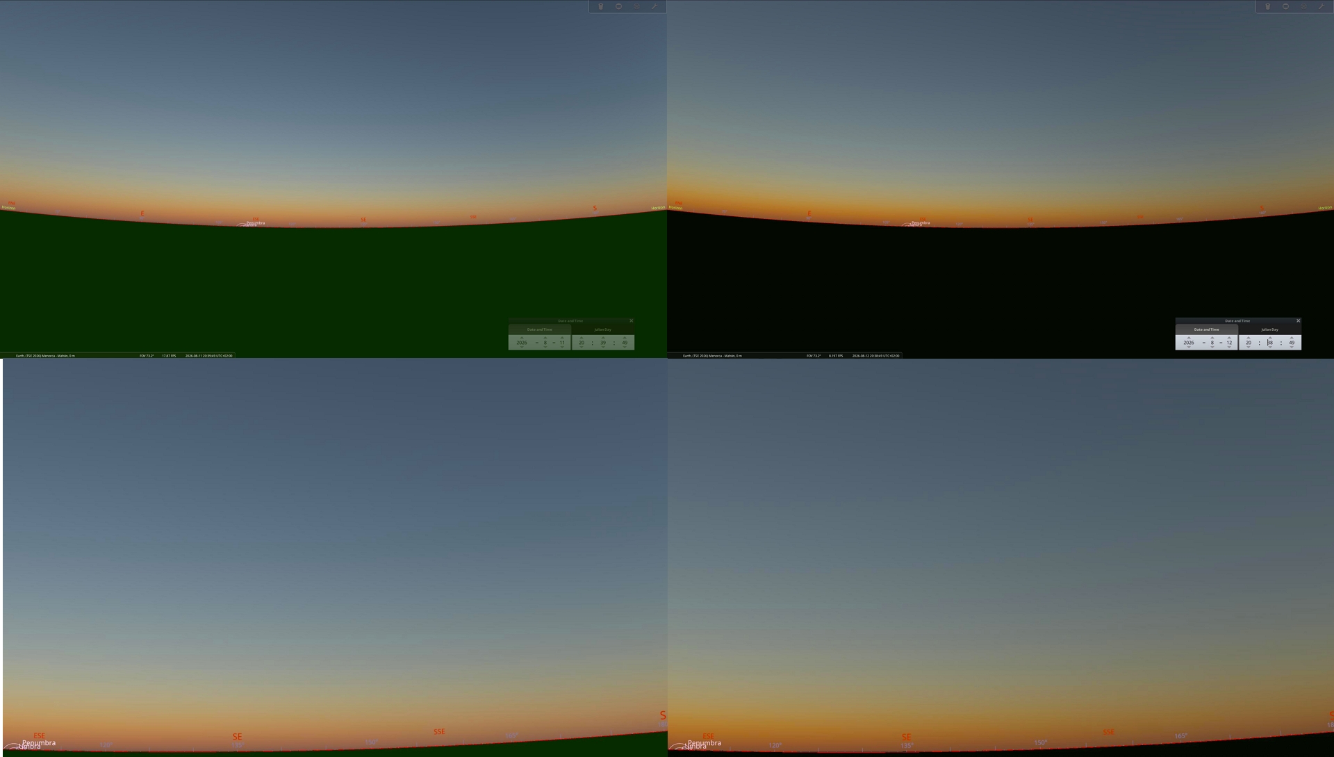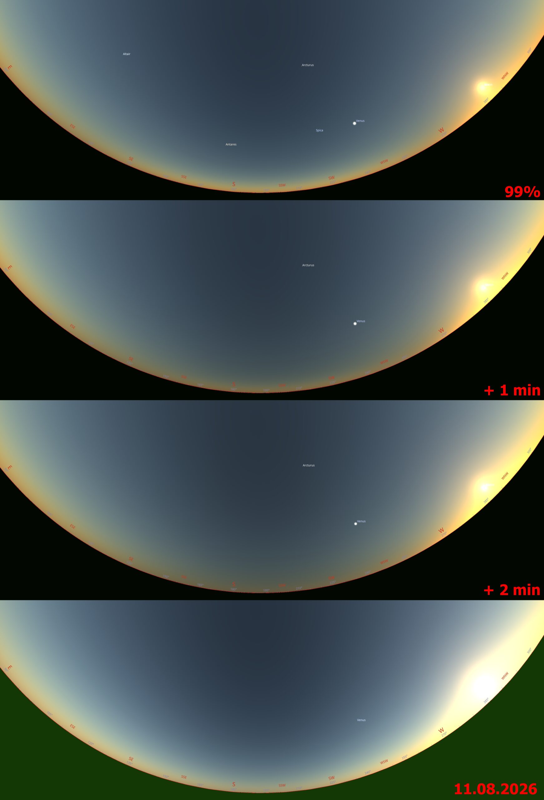 The eclipse at lower altitude has a substantial effect on the sky surface brightness due to reduced direct solar irradiance and the dominance of scattered light. The spectral composition of the sky evolves from typical daylight scattering toward longer wavelengths, producing reddish and eventually bluish-gray tones as totality approaches. They will look very effective in the golden hour and early twilight zones. Notably, the minimum sky brightness does not coincide exactly with the temporal midpoint of totality but occurs slightly thereafter, reflecting asymmetries in atmospheric scattering and the geometry of the lunar shadow. Directional anisotropy in sky brightness becomes pronounced, with brighter sections near the horizon outside the umbral path and darker regions within it.