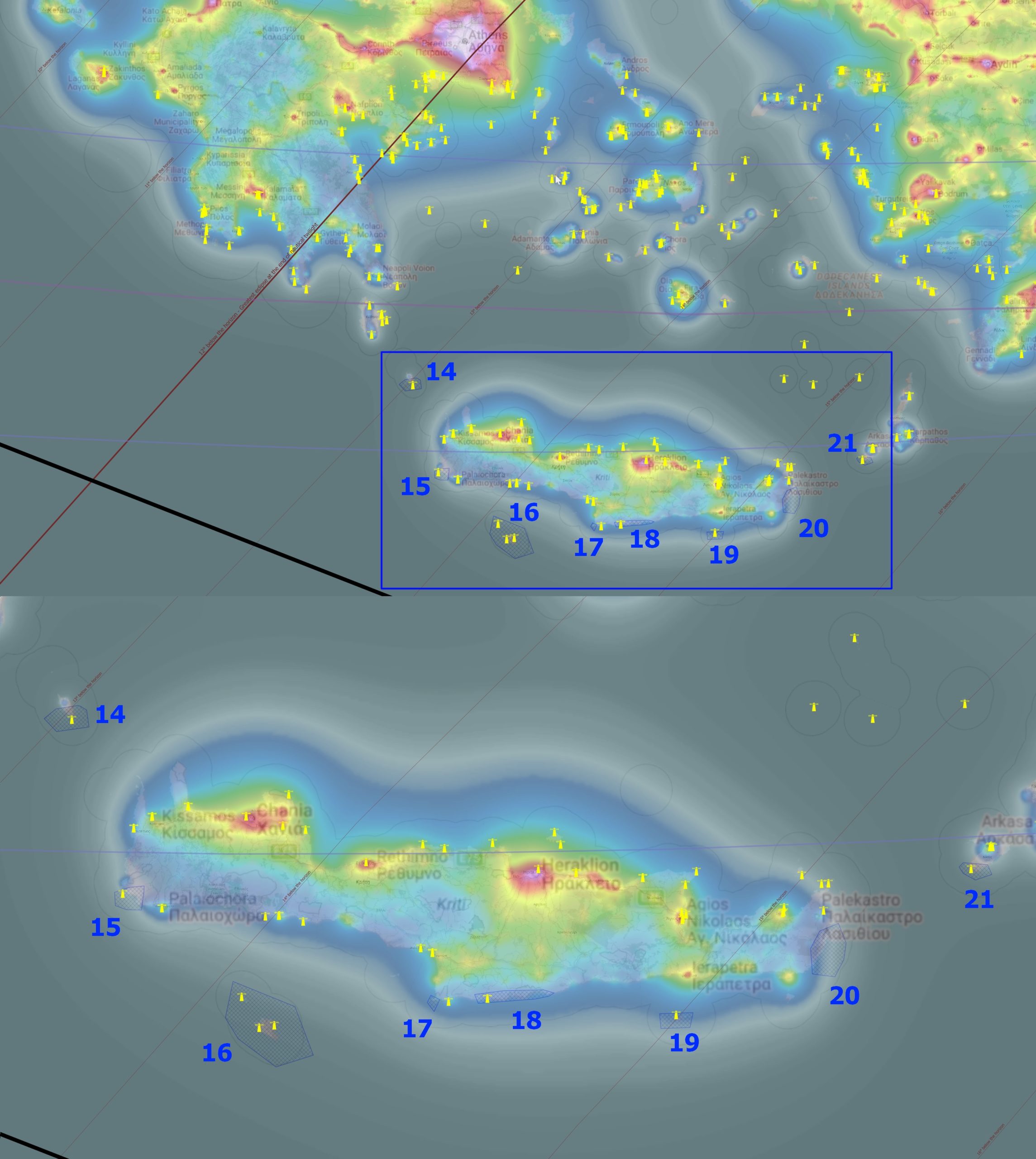 The final area considered is the southernmost part of the Aegean Sea and the eastern Mediterranean Sea, specifically southern Greece. This area lies at the on-the-ground umbral extension zone. Southwestern Crete nearly misses the northern limit of the umbra projection in the space, but because the eclipse event will occur at least 13° below the horizon, it doesn’t matter, as the zenith sky is going to be rather black. In this situation, an observer will see the umbra limitation above the western horizon, being in the vicinity of the lower part of the atmosphere illuminated by the Sun (learn more in this article). Concluding, the effect in Crete should be visible quite well, but the sky should be free of light pollution. The map below indicates potential observation locations for the evening of August 12.