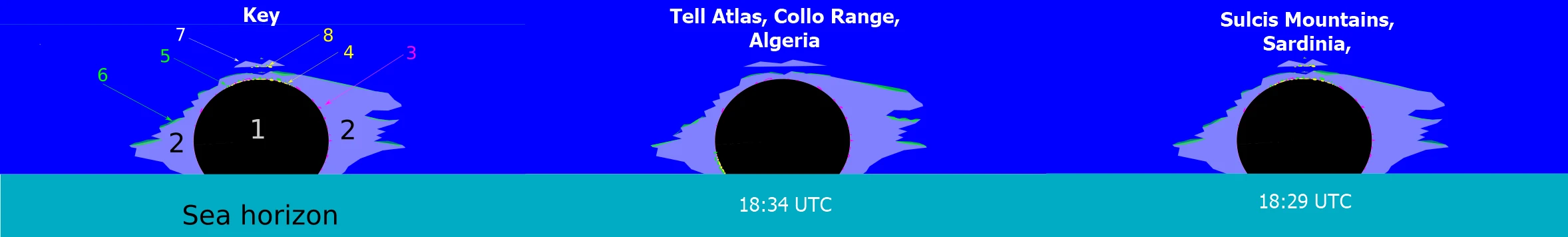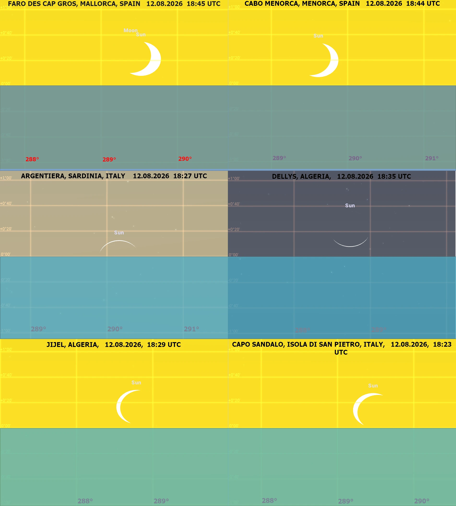 The second area considered lies entirely along the African coast and is referred to as the Mediterranean South for simplicity. Amidst all the regions, it’s the best for observation of the event, which in fact will occur within the astronomical twilight zone.