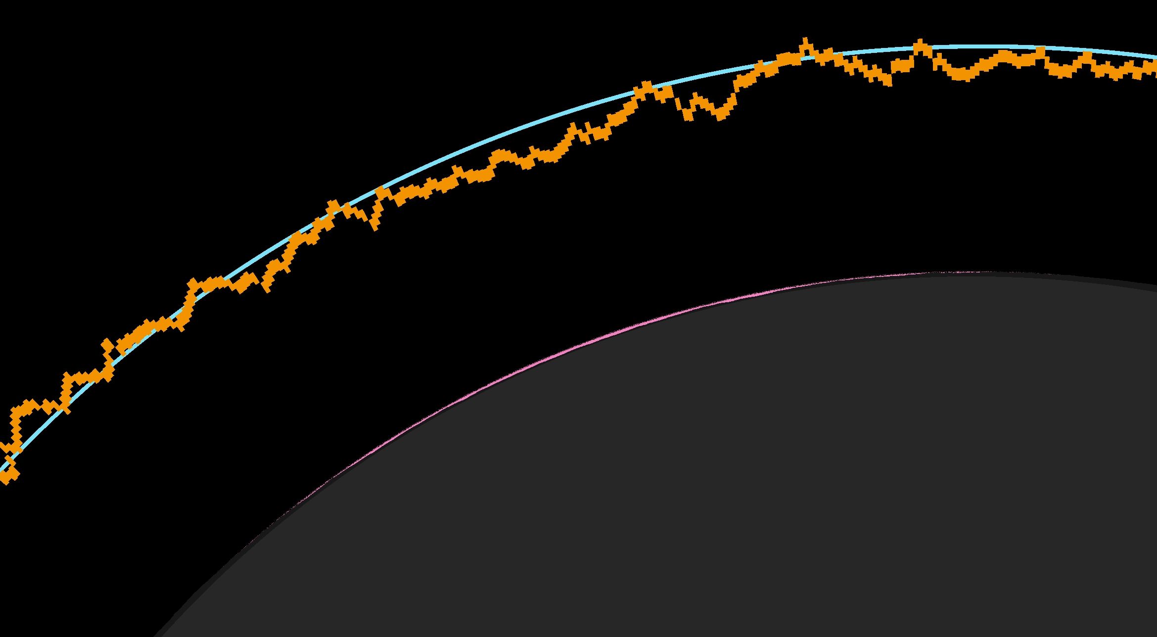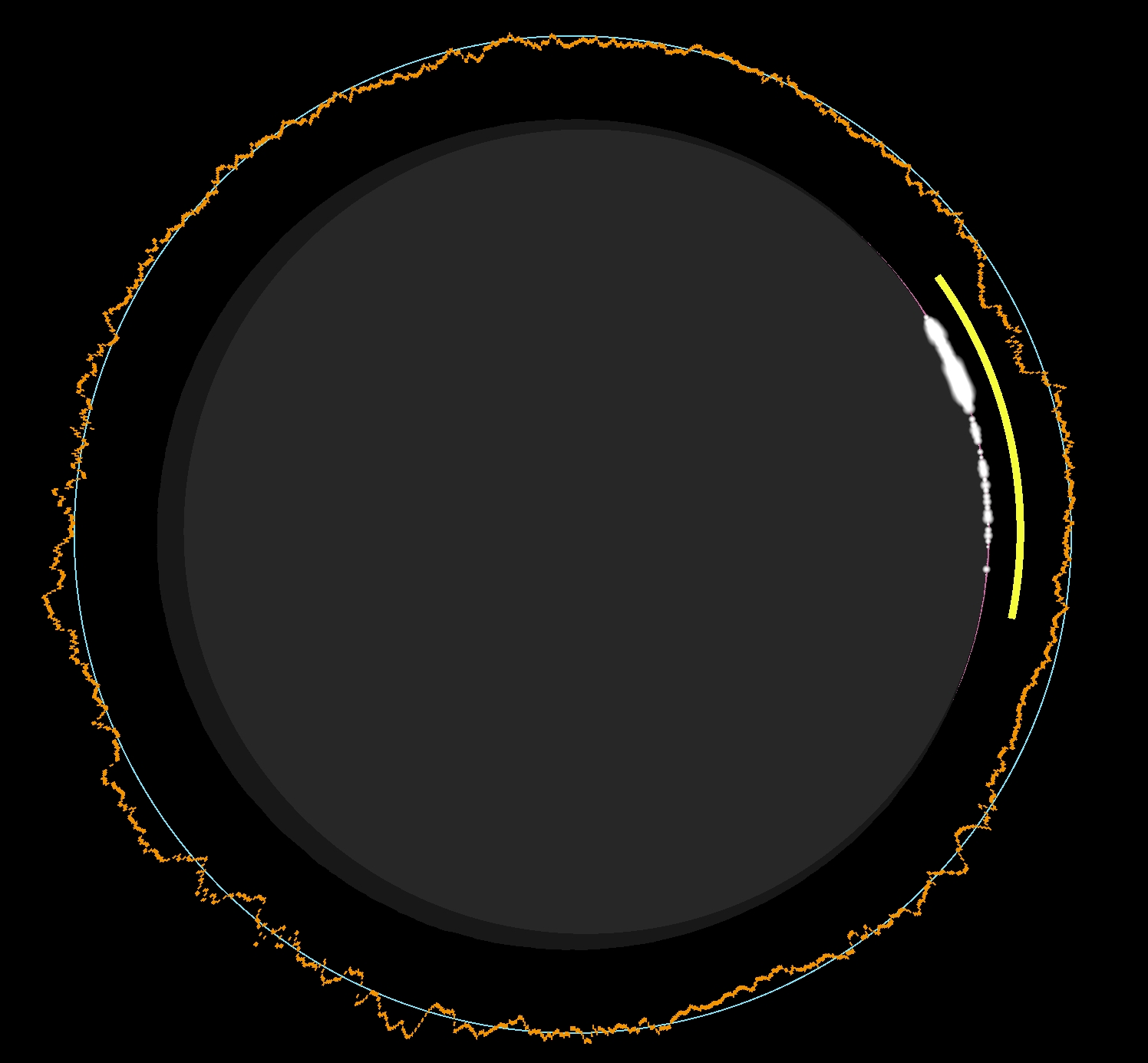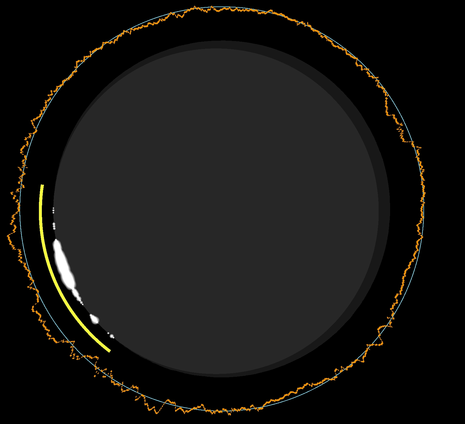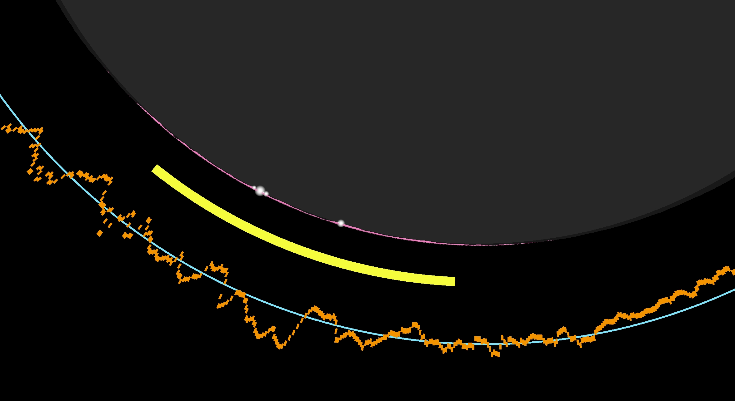 For the altitude of 36 km, we can practically estimate the dark sky at daylight, and the true limitation of the umbra from the perspective of this altitude. Based on the estimates above, the shift in umbra extension is significant and effectively eliminates the possibility of observing it directly from western Sicily. Of course, the umbra will definitely be seen in the sky because of the lack of direct sunlight scattering. However, as mentioned in the chapter 15, the effect won’t be as pronounced as it might appear from a more suitable location. The actual motion of the shadow is shown below (Pic. 110). As discussed in this article, we should view it from a space perspective, as ground-based computations are no longer viable.