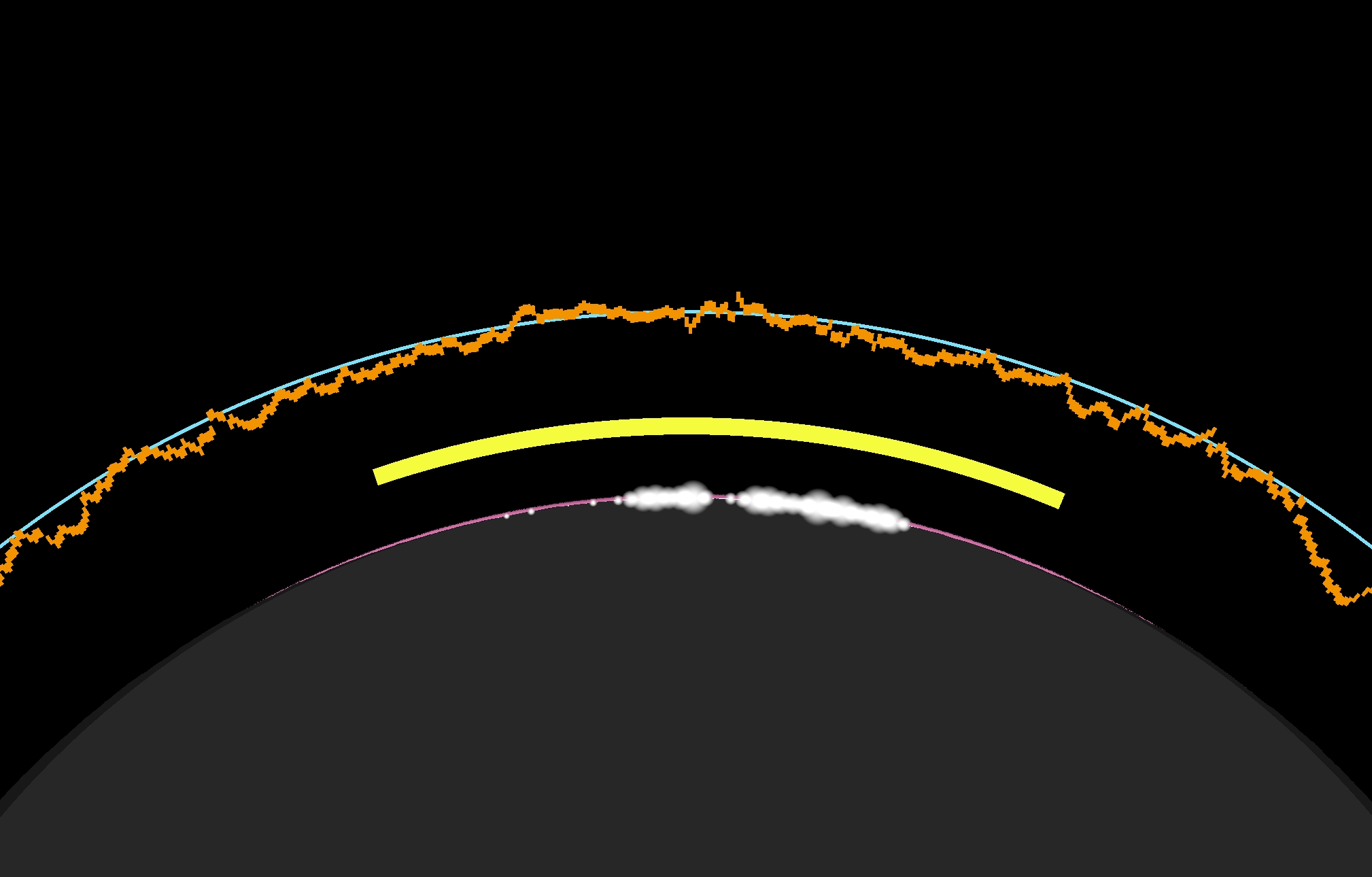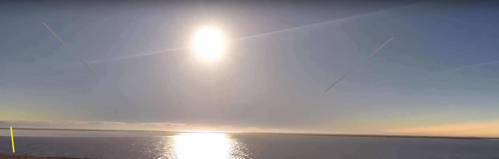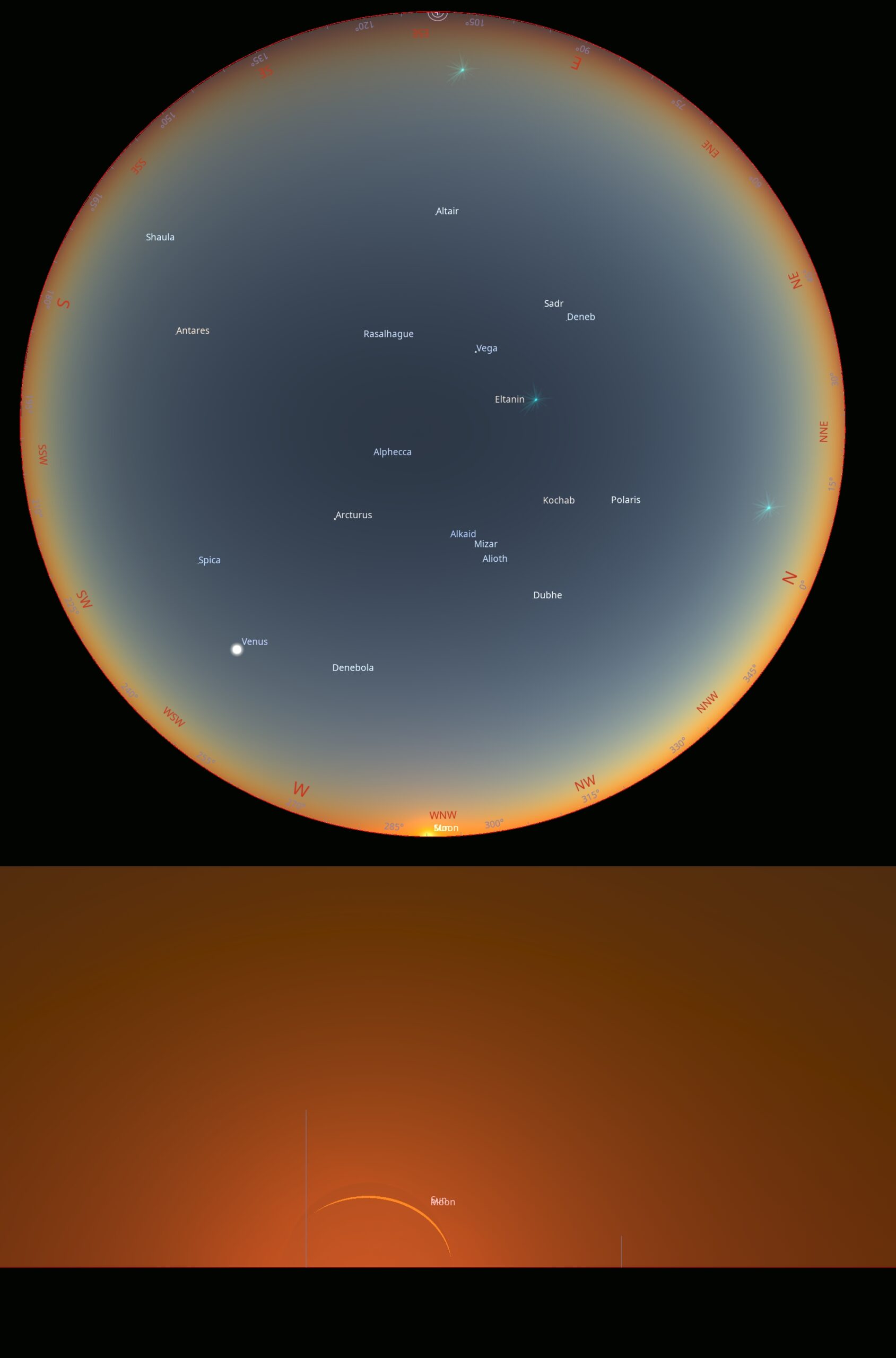 Since the Sun will be visible only 1° above the geometrically dipped horizon, we should consider how the geometrically dipped upper boundary of the troposphere, approximately 10 km above the local horizon, is typical for high-level cloud development. The Sun can be at least partially blanketed by the clouds located at a distance of over 600 km away from the observation point. The Space Engine image above shows a sample cloud deck at an altitude of 10 km, which gently veils the horizon sky on the left.