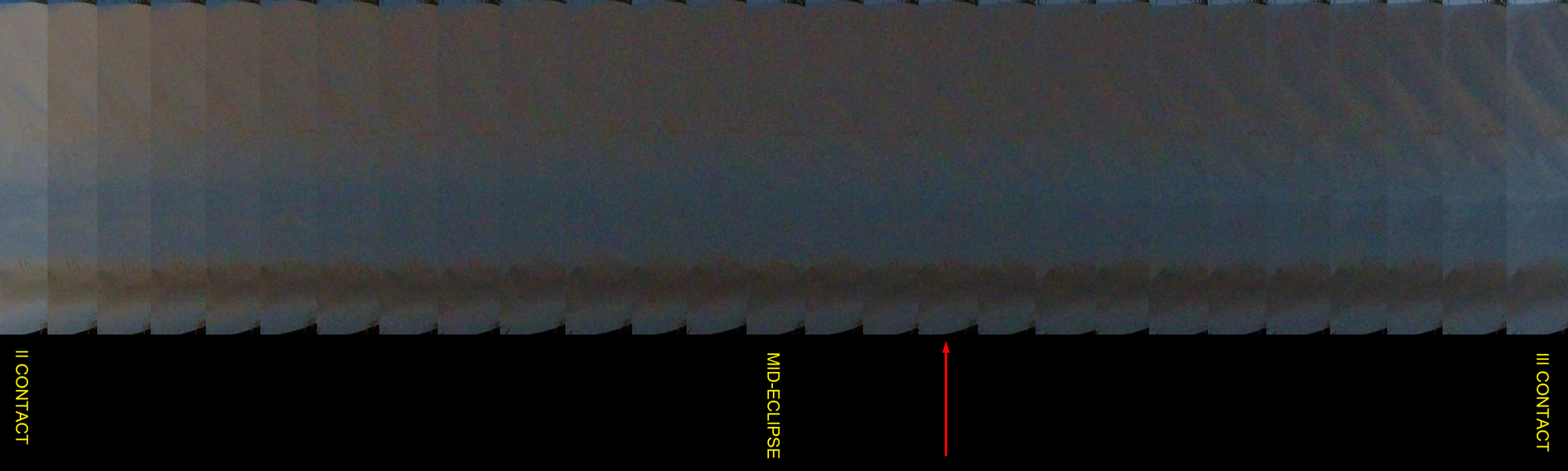 Just after the second contact, the solar disk became fully obscured, yet the atmosphere outside the umbra remained illuminated. Consequently, the brightest scattered light originated from the shadow-out sector of the sky. If this section occurs in the same part of the sky where the Sun is located, forward scattering takes hold. In turn, the observer sees enhanced brightness in this region due to the relatively small angular separation between the Sun and the adjacent illuminated atmosphere. As a result, the zenith appeared darker than the southeastern horizon during the initial seconds of totality.