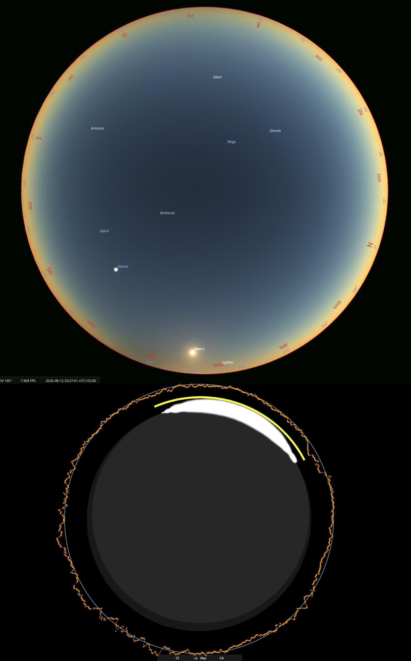 This is a groundbreaking project designed to capture the entire scene from an altitude of 32-34 km above the ground. I was fortunate to participate as a speaker at the recent Solar Eclipse Conference (SEC 2025) on June 13-15, 2025, in Leuven. My primary area of study is the impact of solar eclipses on twilight, which, with the exception of a few publications, hasn’t been investigated historically and has not been reported by any electronic devices. My speech was placed in the Eclipse Experiences panel, which I closed. The panel began with a remarkable, pioneering observation of the total solar eclipse of 2012 in Australia, conducted from a stratospheric balloon (Stratospheric flight into Totality – Australia 2012), led by the Romanian astronomer and eclipse chaser Catalin Beldea and his team. I was very excited about the project, especially since the observation covered both stratospheric and ground-based perspectives, providing an excellent example of parallax. The totally eclipsed Sun above shone as a thin crescent from the ground. It will be described on the main page later. After finishing Catalin’s speech, there was a typical question panel, as usual, after every speaker’s performance. I asked about the possibility of viewing the totality from the path’s extension on August 12, 2026, with optional locations of Sardinia, Sicily, or Tunisia. The totality at these locations occurs after sunset, but because of the relatively small solar depression, the event can still be observed from above! The elevated view of the eclipse, as well as its impact on twilight from the ground’s perspective, has fired my imagination since 2015. Catalin concluded that the idea is very good and that we, as astronomers, can pursue it, especially since a similar approach has never been implemented globally. Unfortunately, I am not technically strong and am only moderately proficient in computations, so I am doing my best to support the team on the graphical side.