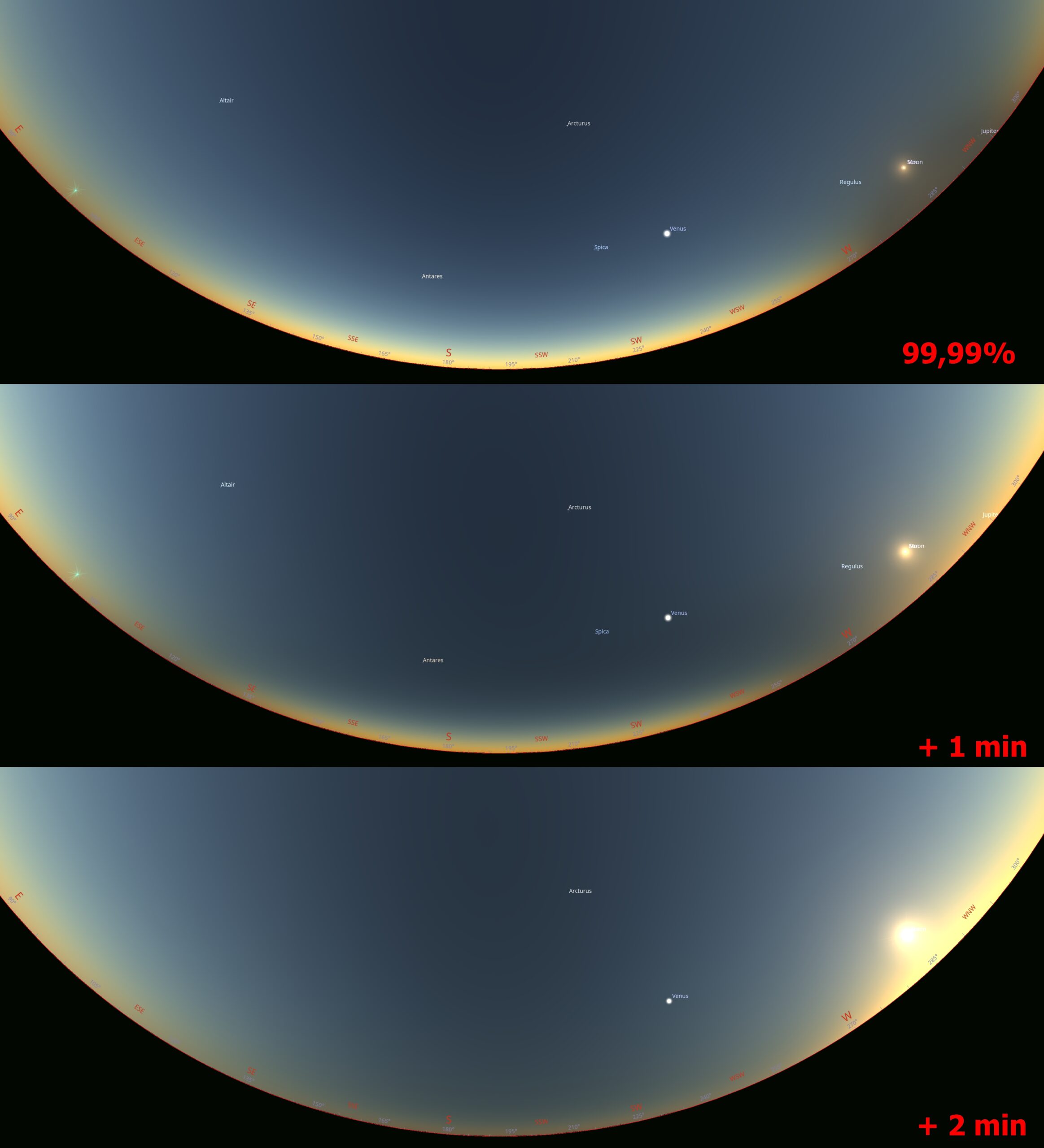 Flying into the stratosphere around 45 km southwest of Sicily guarantees at most 20s of totality with the Sun located approximately 1° above the geometrically dipped horizon (Pic. 115).