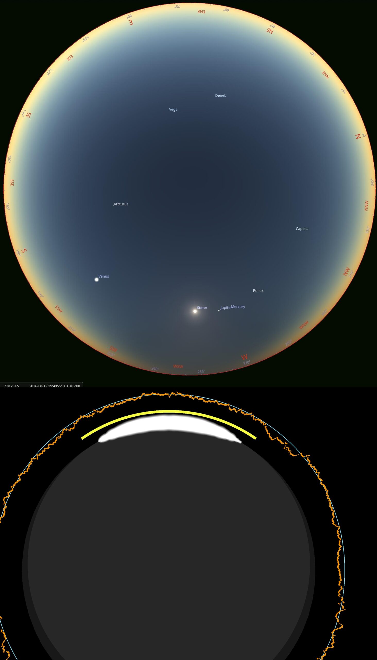 The article presents a detailed scientific analysis of the total solar eclipse of 12 August 2026, with its extension below the horizon, including particular emphasis on its geometric configuration, atmospheric interactions, and observational phenomena. This eclipse is specific, as it falls almost under a Type V event, in which totality occurs in one part of the day, predominantly after local noon. The path of totality is situated at higher latitudes, resulting in a comparatively low solar elevation of approximately 26.5 degrees above the horizon. This geometry significantly influences the overall width of the path and the position of the shadow visible in the sky against the eclipse path projected on the ground.