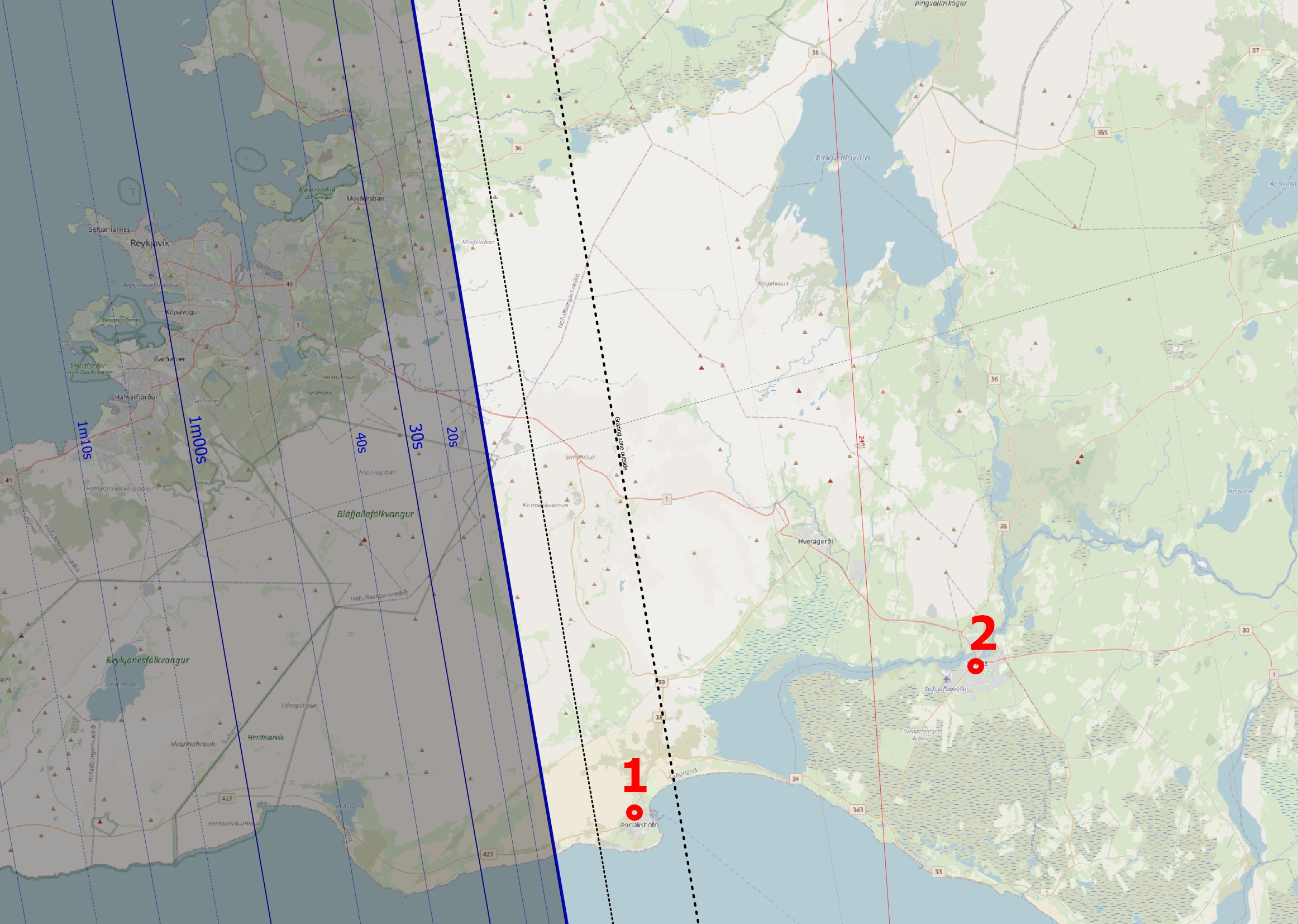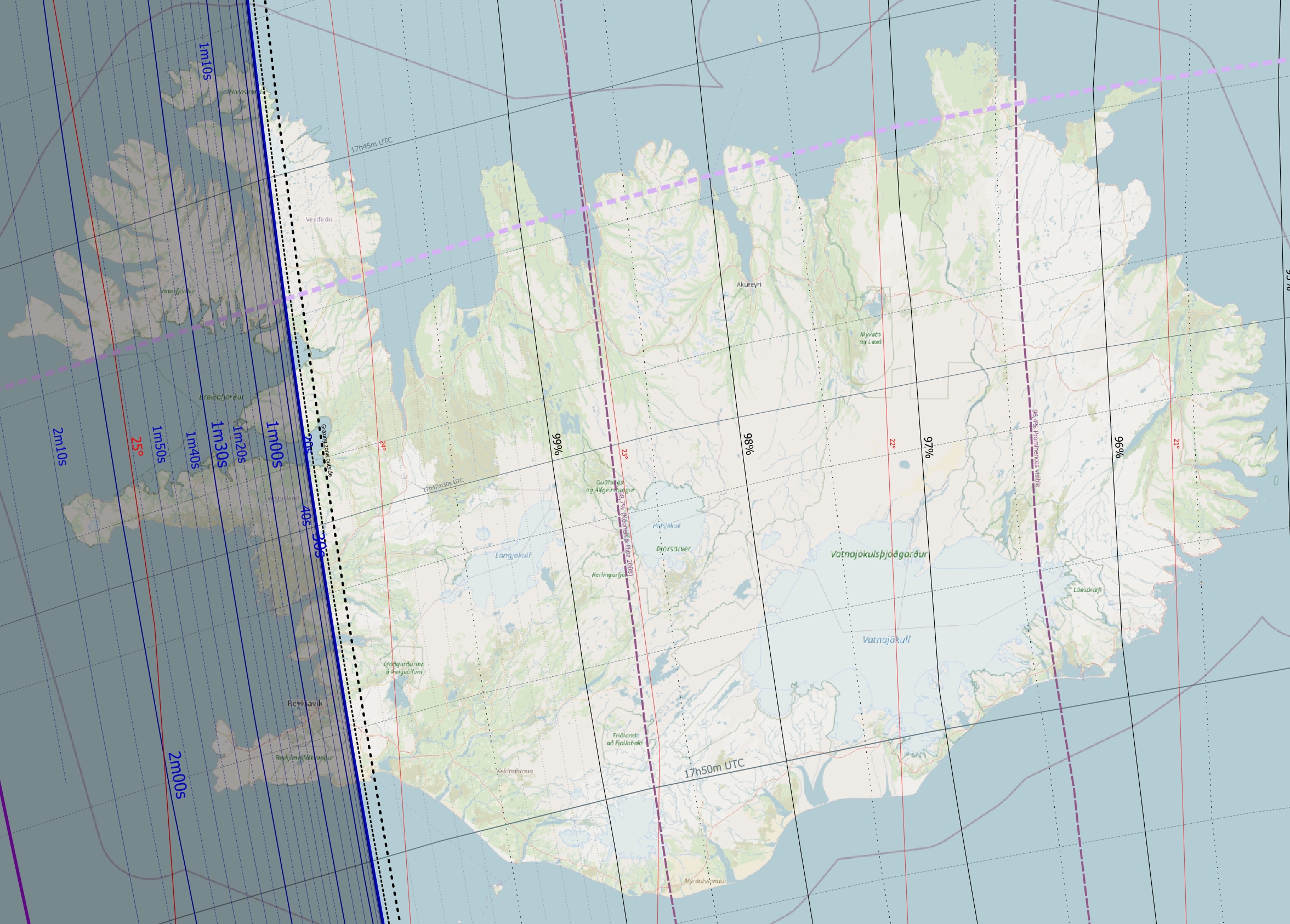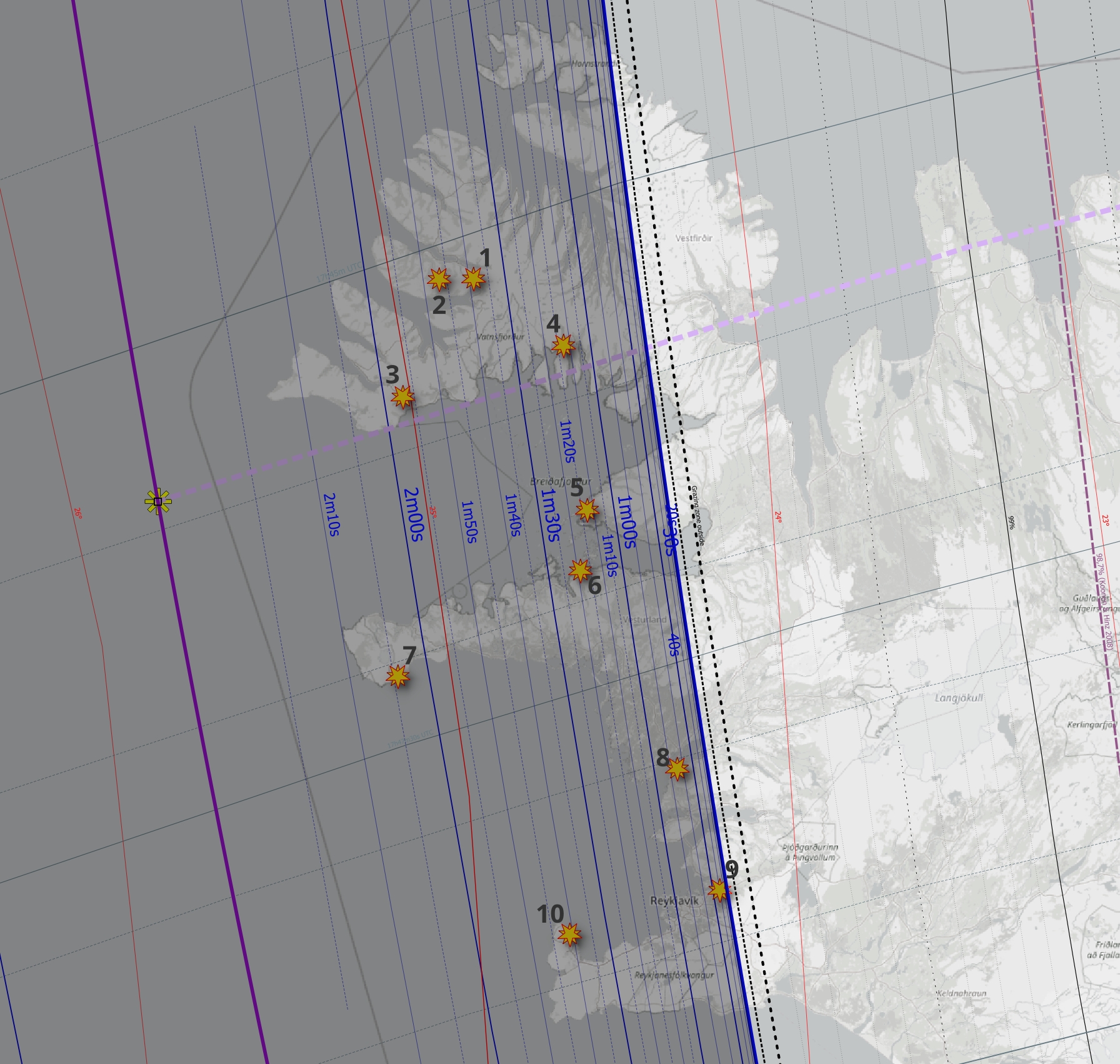 Within the Reykjavik boundary, the duration of totality varies dramatically, from 27s to 1m13s. It must be translated into the umbra position in the sky and into the Baily’s Beads projection, as presented below.