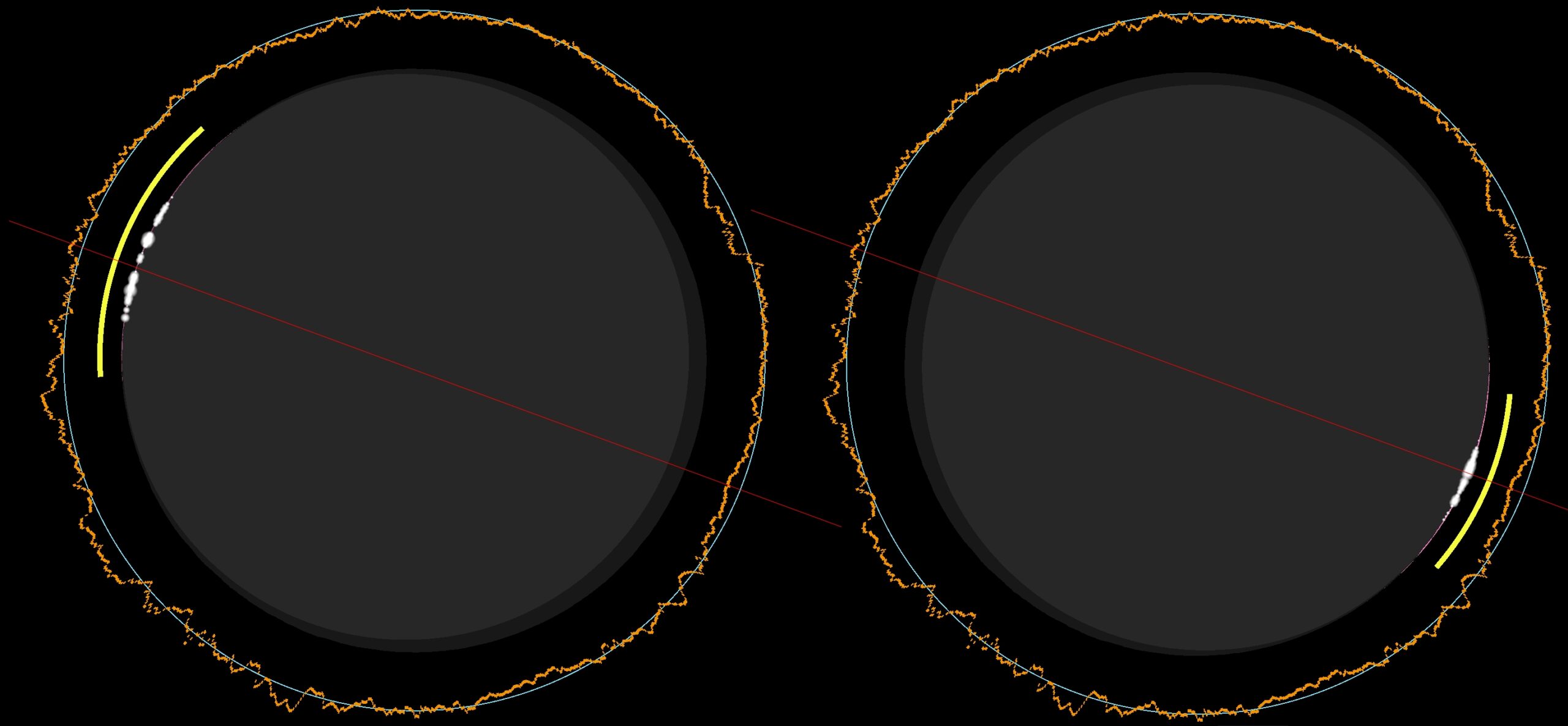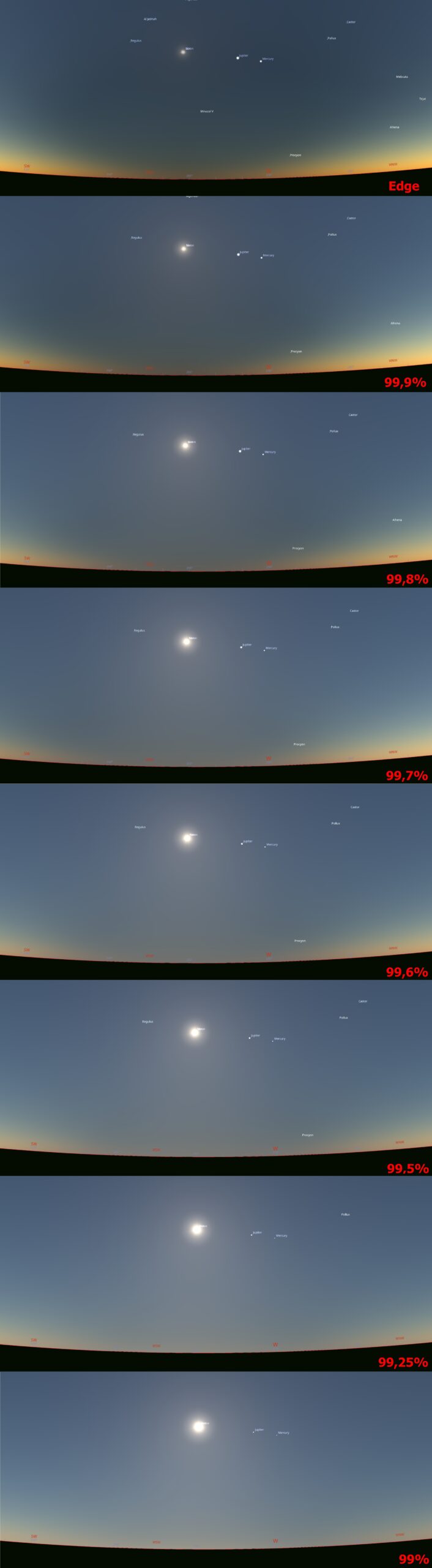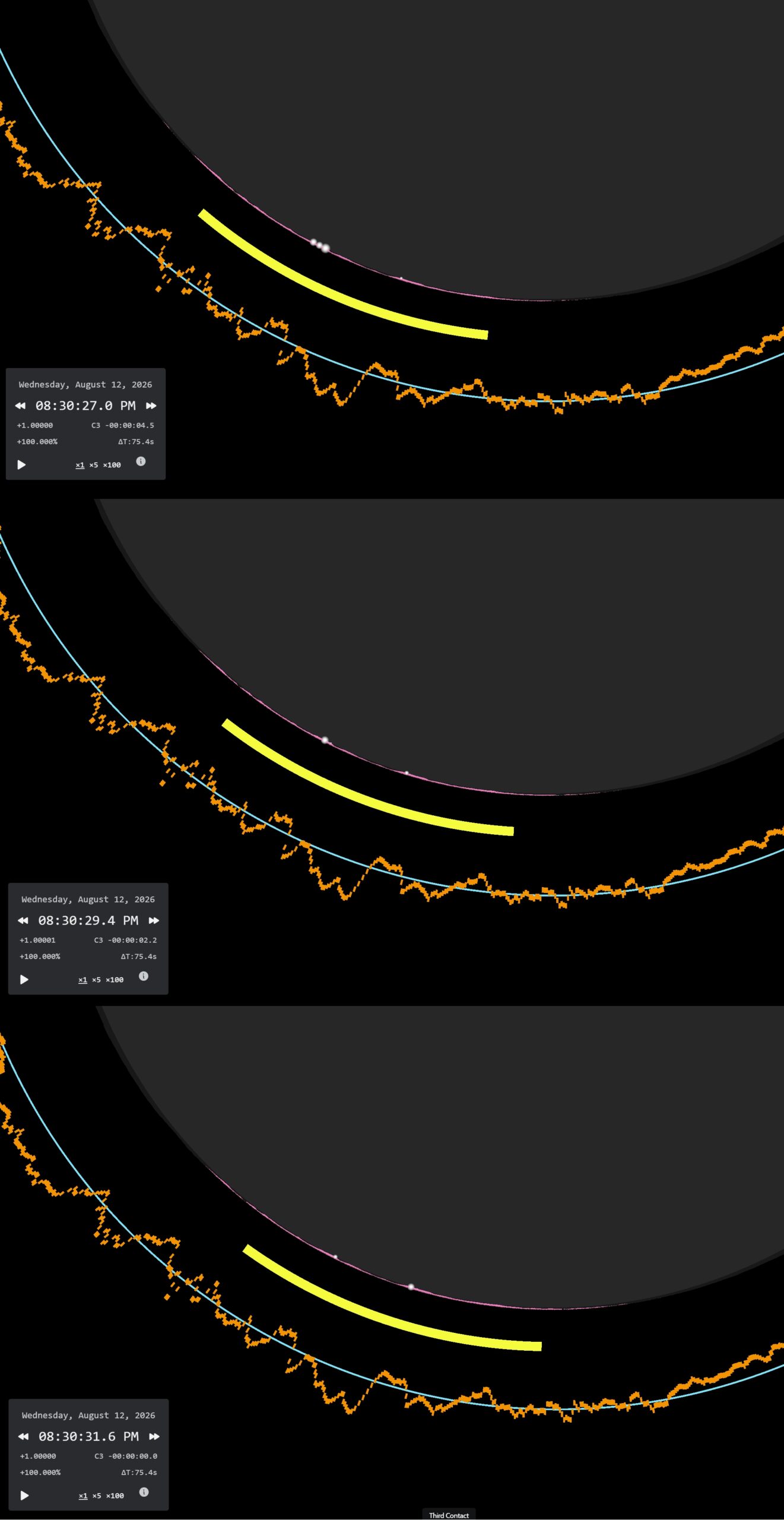 D. BAILY’S BEADS – are caused by rugged lunar topography, which allows the solar rays to shine through the Moon’s valleys. The most effective Bailey’s beds can appear around 22 seconds before totality, when obscuration is greater than 99,5%. You will find a lot of information on the internet about Bailey’s Beads and their reports. Because this thread is dedicated to supplementary stuff, I can share the fantastic tool, a genuine counterpart to Xavier Jubier’s Solar Eclipse Maestro, unfortunately available only for macOS. By purchasing the Pro version of the PhotoEphemeris web-based application, we have access to a modern eclipse simulator that provides Baily’s beads predictions on the same basis as the Solar Eclipse Maestro. As a result, we have the eclipse panel where these events can be visualized under various lightning conditions. The example can be seen below (Pics. 26 and 27), and some circumstances for random eclipse locations are considered, as described in subchapters 5.1, 5.2, and especially 5.3.