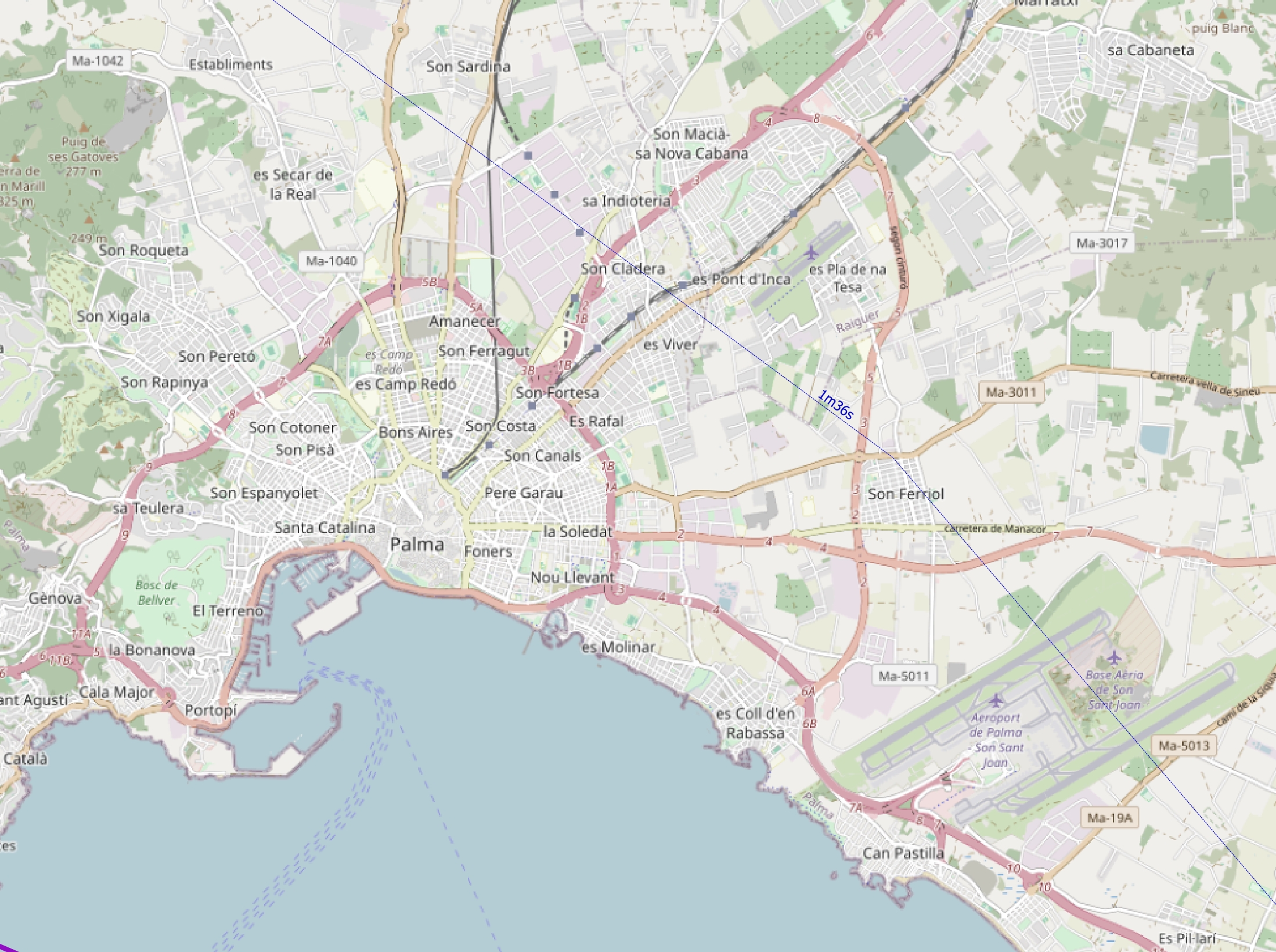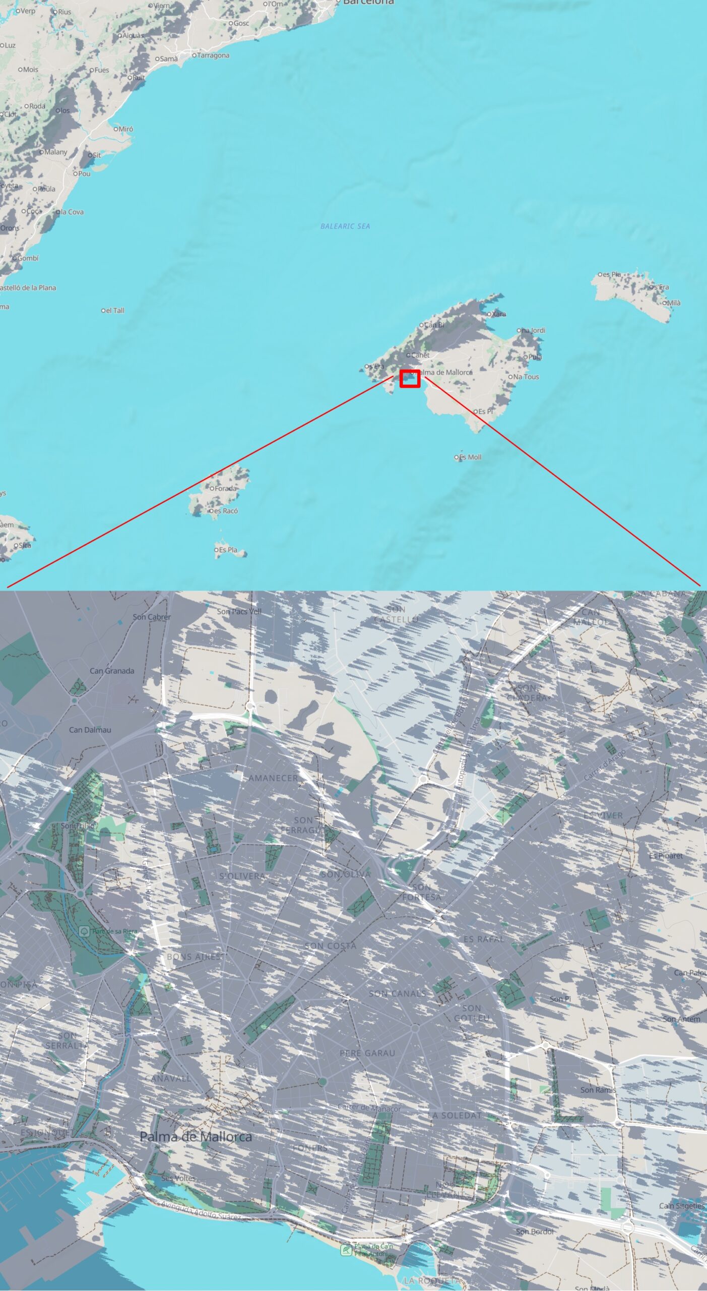 The longest duration of 2m18s occurs about 40km southwest of the western fiords, where the most extended duration on the ground is 2m13.2s. The eastern Mallorca will experience the shortest duration at the centerline – 1m 35.5s.