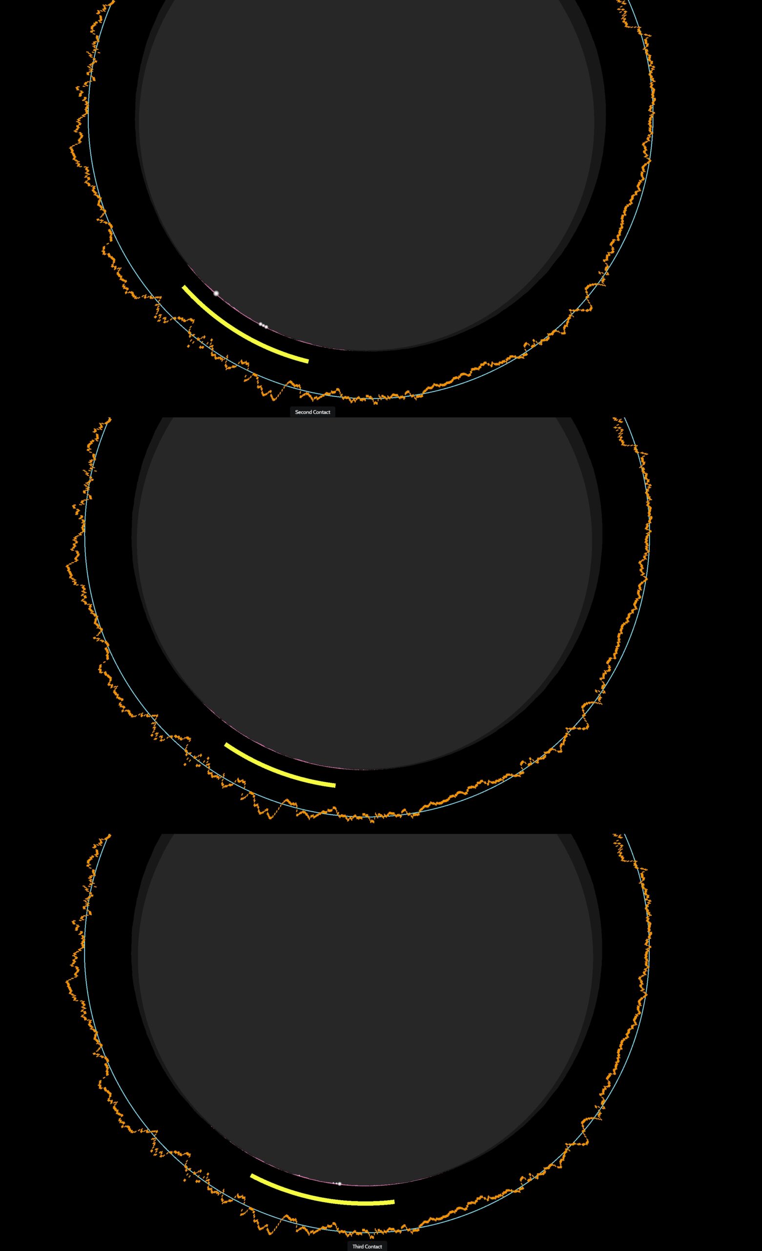 During totality, the temporary obscuration of the solar photosphere enables direct observation of the chromosphere and corona. Thanks to modern visualizations of the lunar limb profile, we can determine the location around the Moon’s limb where the Baily’s beads disappear and reappear at the third contact. On top of that, knowledge of the lunar limb profile helps us determine where the double diamond ring can be observed.