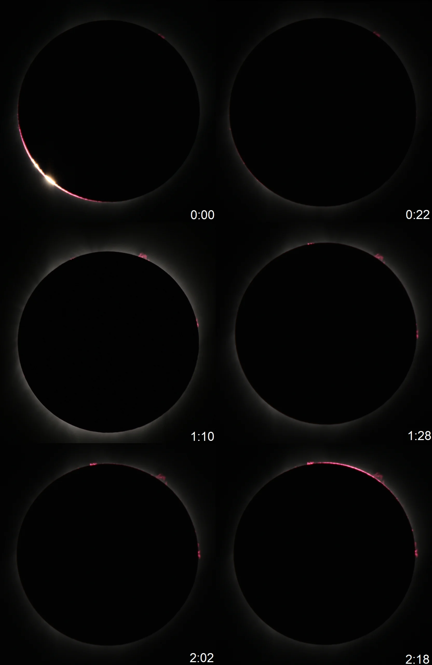 B. SOLAR PROMINENCES AND THEIR MOVEMENT – Along with the prediction of the solar corona behaviour, we can check what the solar prominences can look like in the near future, directly preceding the eclipse event. Typically, solar prominences become strikingly visible during total solar eclipses. Usually, a total solar eclipse means the Moon’s disk is slightly larger than the Sun’s. Thereby, some of the prominences are visible at the beginning of totality, and others at the end, about which you can read in detail in this article. Among eclipse phenomena, their apparent motion against the lunar disk offers measurable scientific value. Before and after totality, the chromosphere appears briefly as a thin pink rim. Simultaneously, prominences project beyond the lunar edge. Their shifting position along the dark disk reveals the Moon’s steady progression.