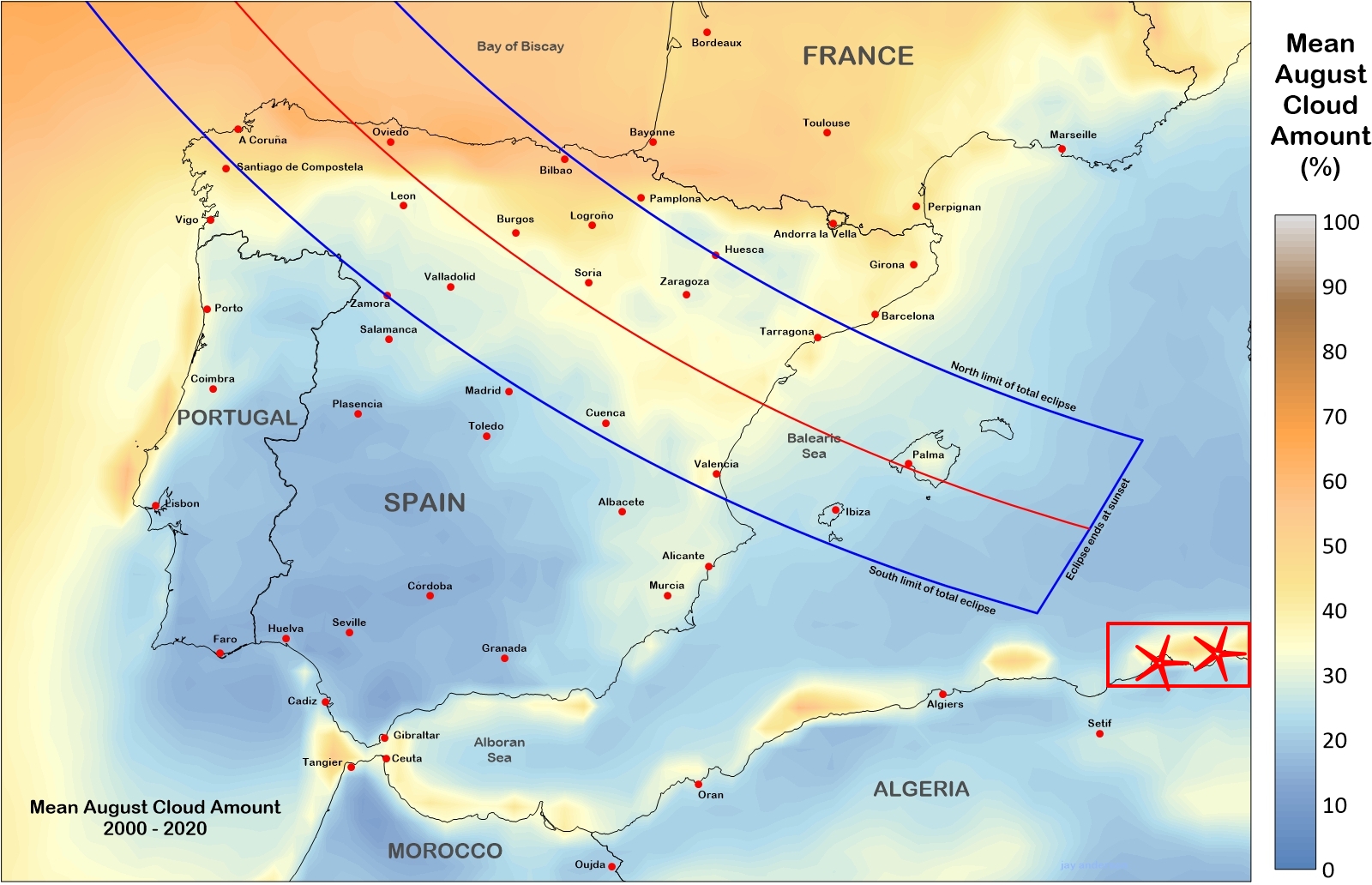 In this situation, to ensure the project’s success, clear weather over the Balearics and a geometric end of the path are necessary. A similar map was projected for ground-based eclipse observers within the path. Since the fully-developed cumulonimbus or high-level clouds (i.e., cirrus) can disrupt the ground observation over 350km away, what happens if the stratospheric balloon records the eclipse from an altitude of 34 km?
