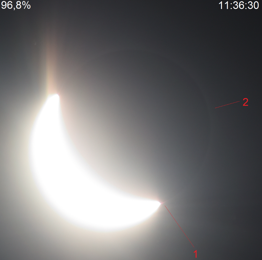 E. DIAMOND RING – this most distinct feature of the eclipsed Sun, which is observed along the Baily’s Beads. This is a glittering diamond (final spot of solar beams) set on a ring (bright solar corona), visible about 10-25s before totality completes (Pic. 28).